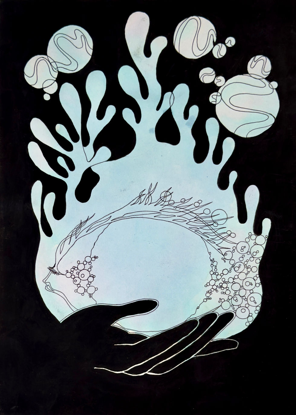 This series was created during a workshop in 2013. As a starting point, we produced our own handmade papers using the marbling technique with acrylic paints. These organic, fluid surfaces became the foundation for a body of illustrations rooted in dreams.